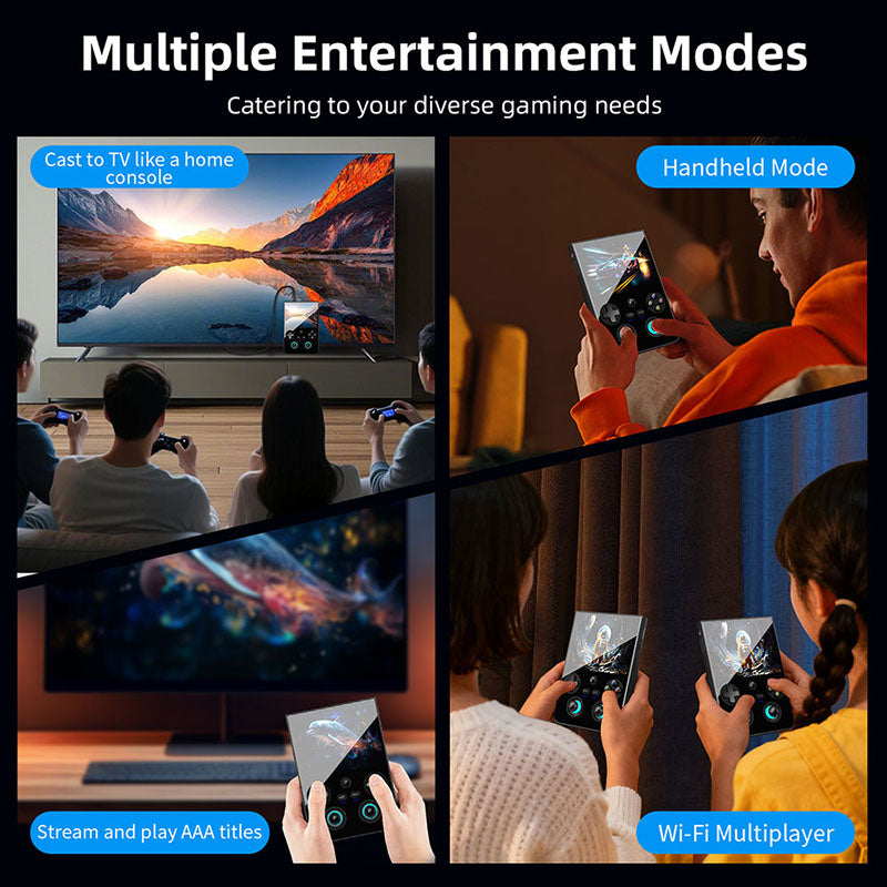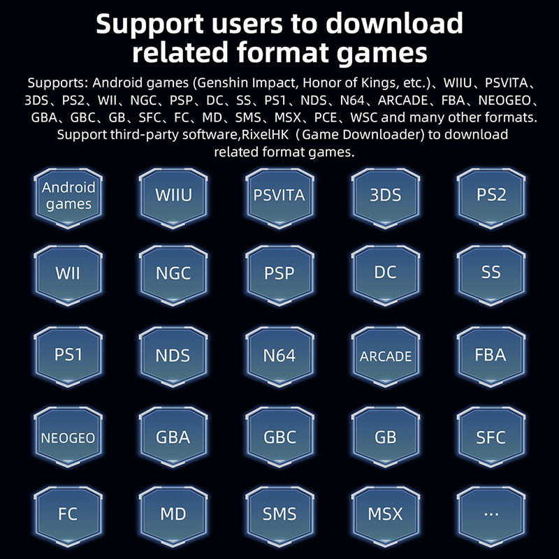 Screen: 4.7-inch LTPS In-Cell display, OCA full lamination, multi-touch, 1280*960 resolution, supports a maximum refresh rate of 120Hz. CPU: Dimensity 8300 Processor, high-efficiency 4nm process technology 5G SOC chip, Octa-core CPU including 1*A715@3.35GHz + 3*A715@3.20GHz + 4*A510@2.2GHz GPU: Mali-G615 MC6 Storage: 12+256GB/ 8+128GB System: Android 14 WiFi: WiFi 6E Bluetooth: 5.3 Games: Support Android games and other 30+kinds of simulators; Support users to download related format games AI: One-click game guide retrieval, real-time translation, intelligent dialogue, text-to-image generation, image processing, and more features. Language: Multi-language Speaker: High fidelity dual speakers TF Card: Support TF card expansion, up to 2TB Battery: Polymer lithium battery 5500mAh, battery life 8 hours Charging Power: 5V/9V—27W Joysticks: Large-angle 3D Hall joystick RGB Lighting Effect: 16 million color RGB joystick lighting, support breath, rainbow, marquee, chasing and other light effects, support customize the color function. Other Function: Built-in six-axis gyroscope sensor, Built-in DSP Sound Effects Algorithms, high-speed fan + heat pipe active cooling. Supports FOTA wireless upgrades, online multiplayer, streaming, wireless screen projection, USB Type-C supports 1080p display port output (Supports dual-screen display for NDS and 3DS games), vibration motor, supports 3.5mm stereo audio headphones, energy-saving settings, RGB joystick light control, display brightness, various functional attributes and customizable settings. |
