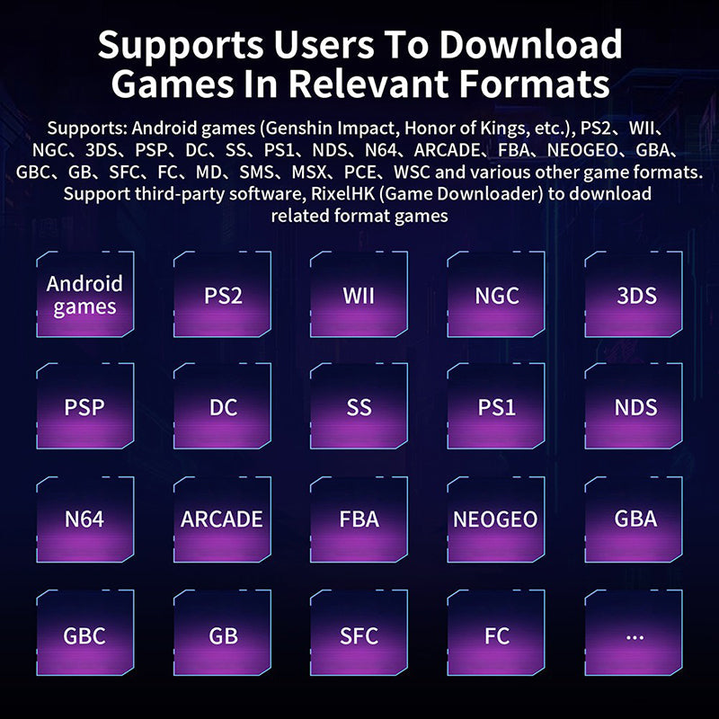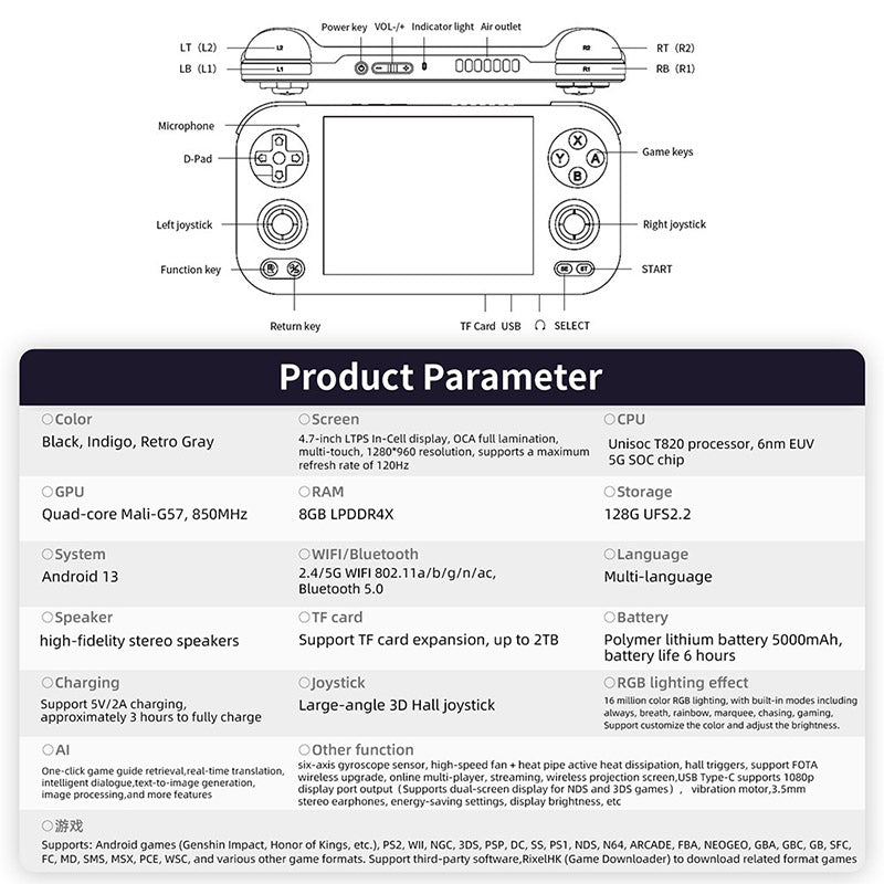 Specification | Screen: 4.7-inch LTPS In-Cell display, OCA full lamination, multi-touch,1280*960 resolution, supports a maximum refresh rate of 120Hz CPU: Unisoc T820 processor, 6nm EUV 5G SOC chip, octa core: 1*A76@2.7GHz + 3*A76@2.3GHz + 4*A55@2.1GHz GPU: Quad-core Mali-G57, 850MHz RAM: 8GB LPDDR4X Storage: 128GB UFS2.2 System: Android 13 WiFi: 2.4/5G WIFI 802.11a/b/g/n/ac Bluetooth: 5.0 Games: Support: Android games and other 30+kinds of simulators; Support users to download related format games AI: One-click game guide retrieval, real-time translation, intelligent dialogue, text-to-image generation, image processing, and more features. Language: Multi-language Speaker: High-fidelity stereo speakers TF Card: Support TF card expansion, up to 2TB Battery: Polymer lithium battery 5000mAh, battery life 6 hours Charging: Support 5V/2A charging, approximately 3 hours to fully charge RGB Lighting Effect: 16 million color RGB lighting, with built-in modes including always, breath, rainbow, marquee, chasing, gaming. Support customize the color and adjust the brightness. Joystick: Large-angle 3D Hall joystick Other Function: Six-axis gyroscope sensor, high-speed fan + heat pipe active heat dissipation, hall triggers, support FOTA wireless upgrade, online multi-player, streaming, wireless projection screen, USB Type-C supports 1080p display port output (Supports dual-screen display for NDS and 3DS games), vibration motor, 3.5mm stereo earphones, energy-saving settings, display brightness, etc. |
