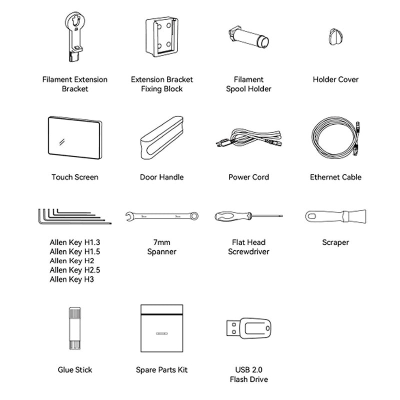 1 x 3D Printer 1 x Filament Extension Bracket 1 x Extension Bracket Fixing Block 1 x Filament Spool Holder 1 x Holder Cover 1 x Touch Screen 1 x Door Handle 1 x Power Cord 1 x Ethernet Cable 1 x Allen Key H1.3 1 x Allen Key H1.5 1 x Allen Key H2 1 x Allen Key H2.5 1 x Allen Key H3 1 x 7mm Spanner 1 x Flat Head Screwdriver 1 x Scraper 1 x Glue Stick 1 x Spare Parts Kit 1 x USB 2.0 Flash Drive 1 x User Manual |